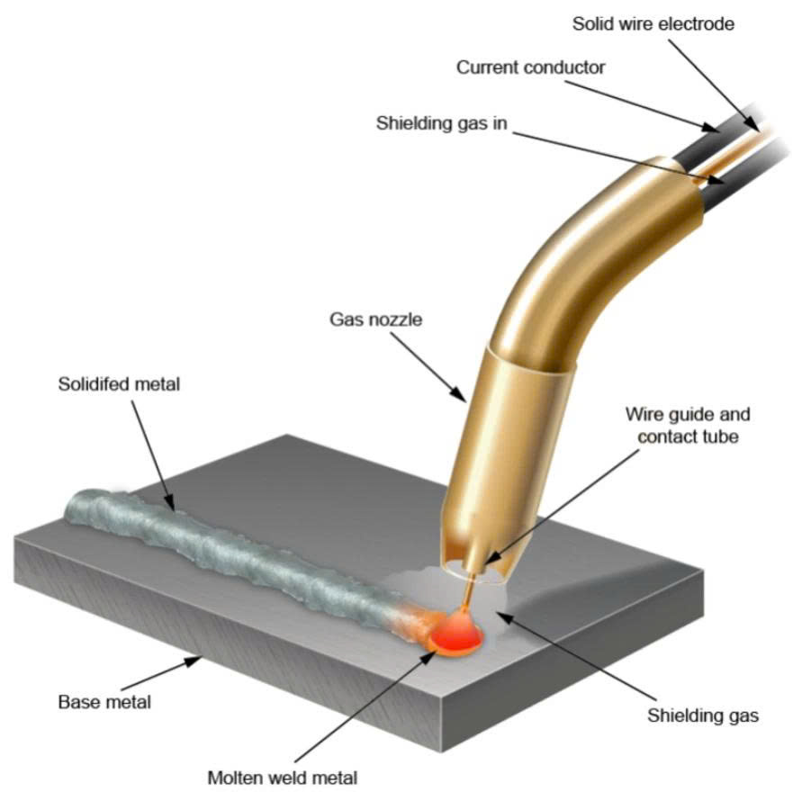 The heat generated by the arc melts both the welding wire and the base material. At the same time, shielding gas is released to protect the molten weld pool. When the molten metal cools down, it forms a solid weld while the shielding gas protects it from oxidation.