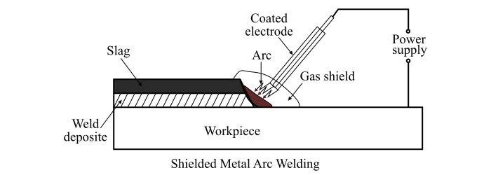 SMAW (Shielded Metal Arc Welding), also known as stick welding or manual arc welding, uses a flux-coated electrode to create an electric arc. The high temperature generated melts both the electrode and the base material, forming a weld that joins the metal pieces together.